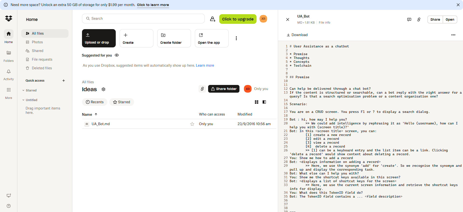 Years later, the original concept remained saved in my Dropbox archive. Returning to those old notes gave me the perspective I needed to flesh out the idea and advance the user assistance bot much further than I originally imagined.